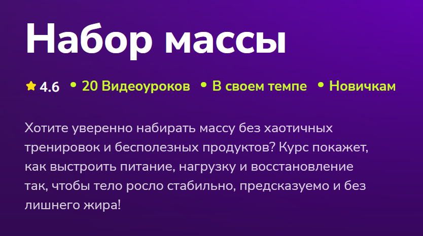 Курс покажет, как выстроить питание, нагрузку и восстановление так, чтобы тело росло стабильно, предсказуемо и без лишнего жира!