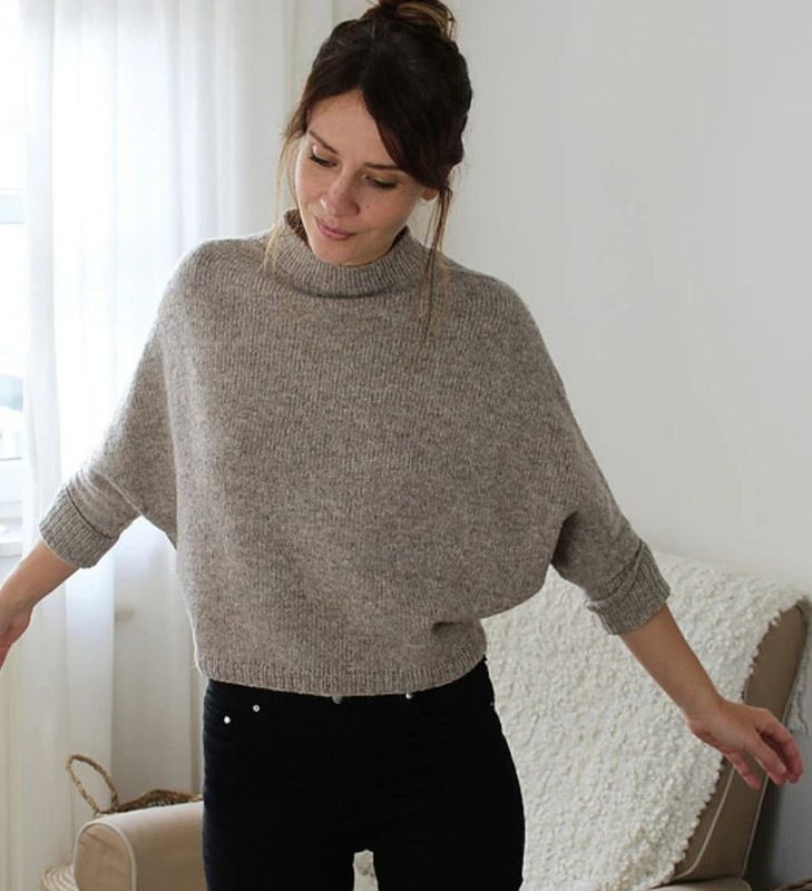 Свитер связан бесшовно сверху донизу. Сначала воротник выполнен по ребристому узору по кругу, затем вырез формируется с помощью укороченных рядов. После формирования выреза работаем над плечами для рукавов летучей мыши. Для пройм передняя и задняя части вяжутся отдельно. Затем петли спереди и сзади объединяются, и вязание происходит по кругу, с уменьшением для нижнего скоса рукава в каждом круге. Свитер заканчивается узким ребристым манжетом.